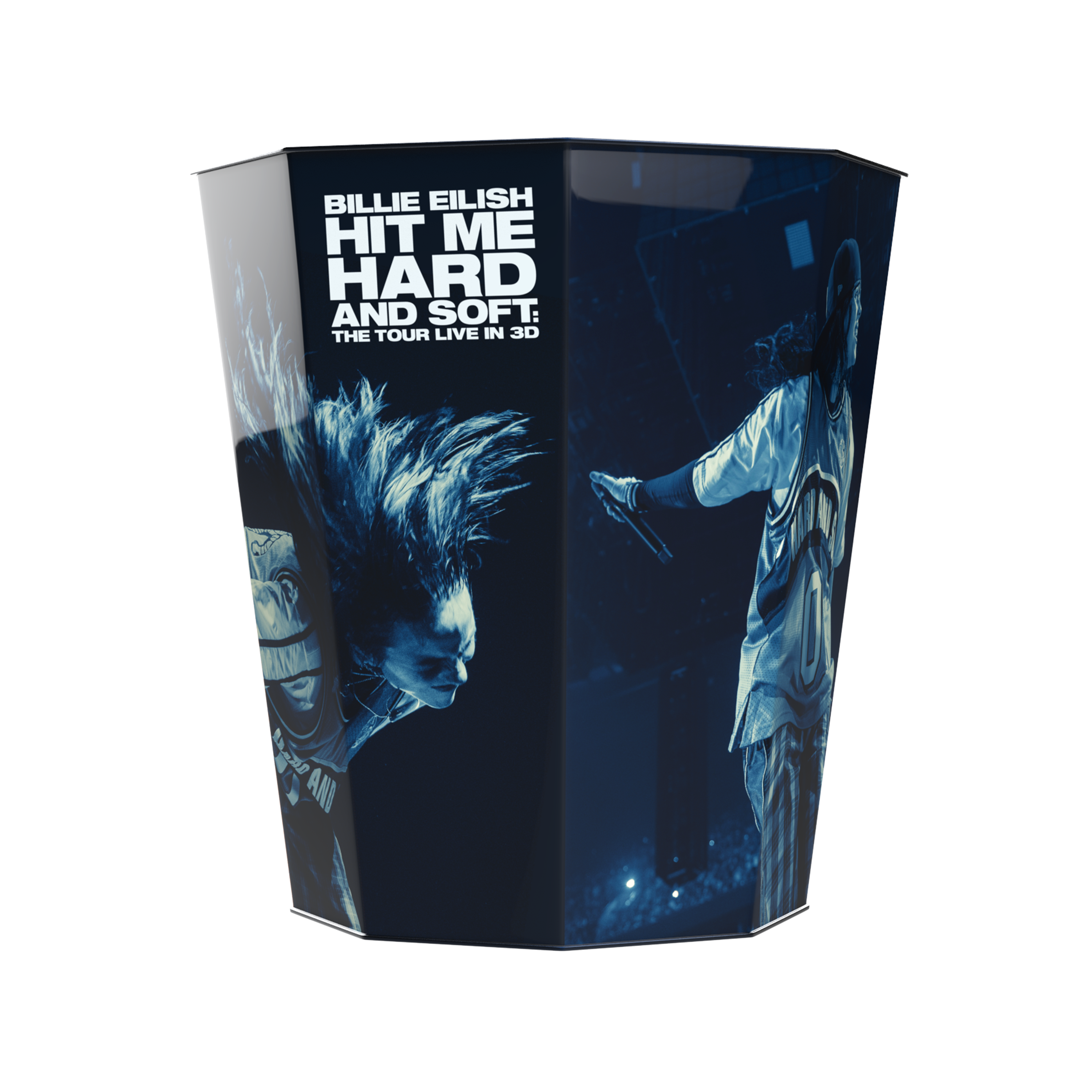 Experience Billie Eilish's groundbreaking concert film with this stunning eight-sided tin popcorn bucket featuring dramatic imagery from her world tour. Wrapped in fiery orange stage lighting and cool blue shadows, this collectible captures the raw energy and artistry that makes Billie one of the most celebrated performers of her generation.