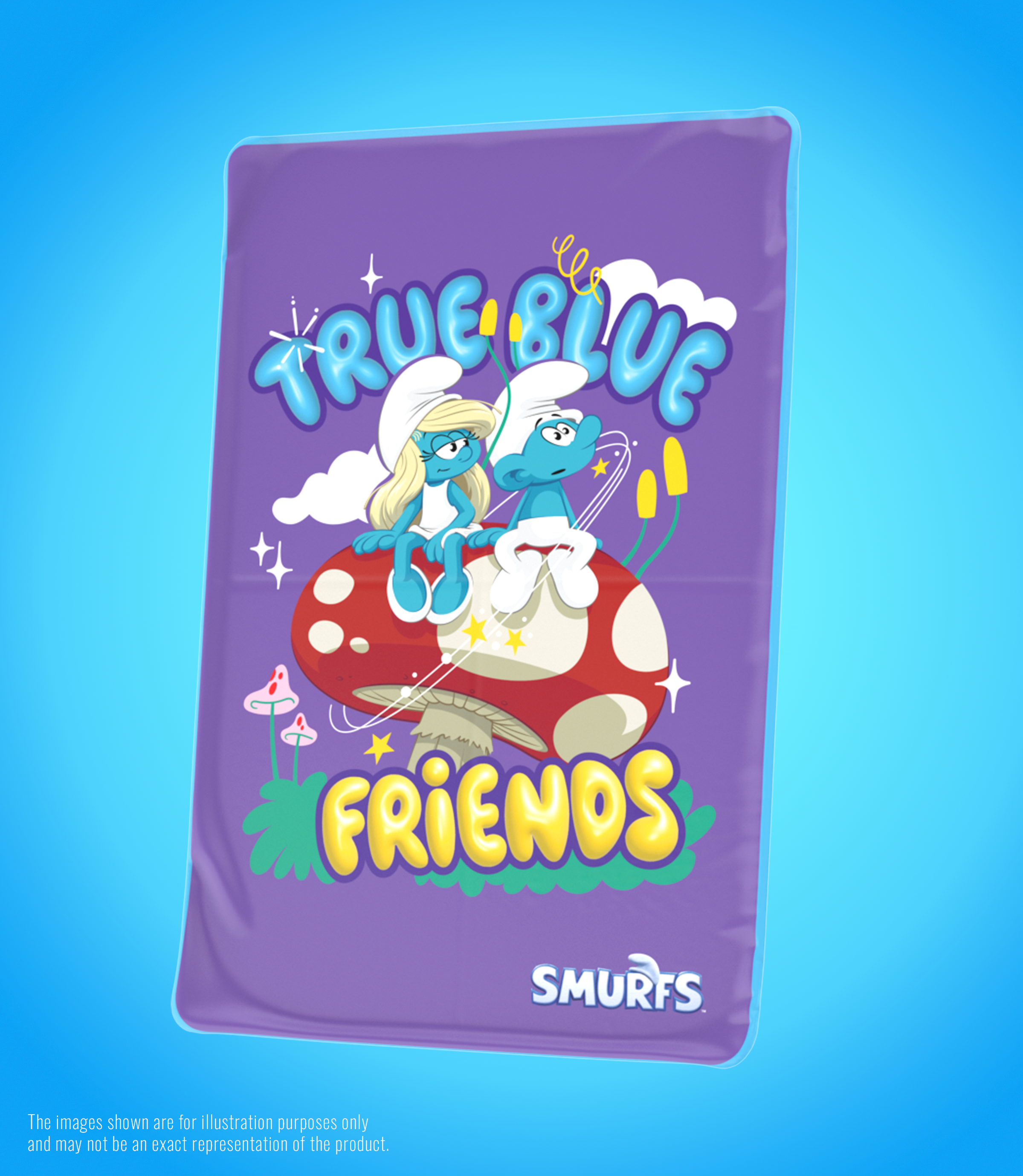 The vibrant purple blanket features Smurfette and a friend relaxing on a spotted mushroom with the cheerful message "True Blue Friends" surrounded by whimsical stars and forest details.
