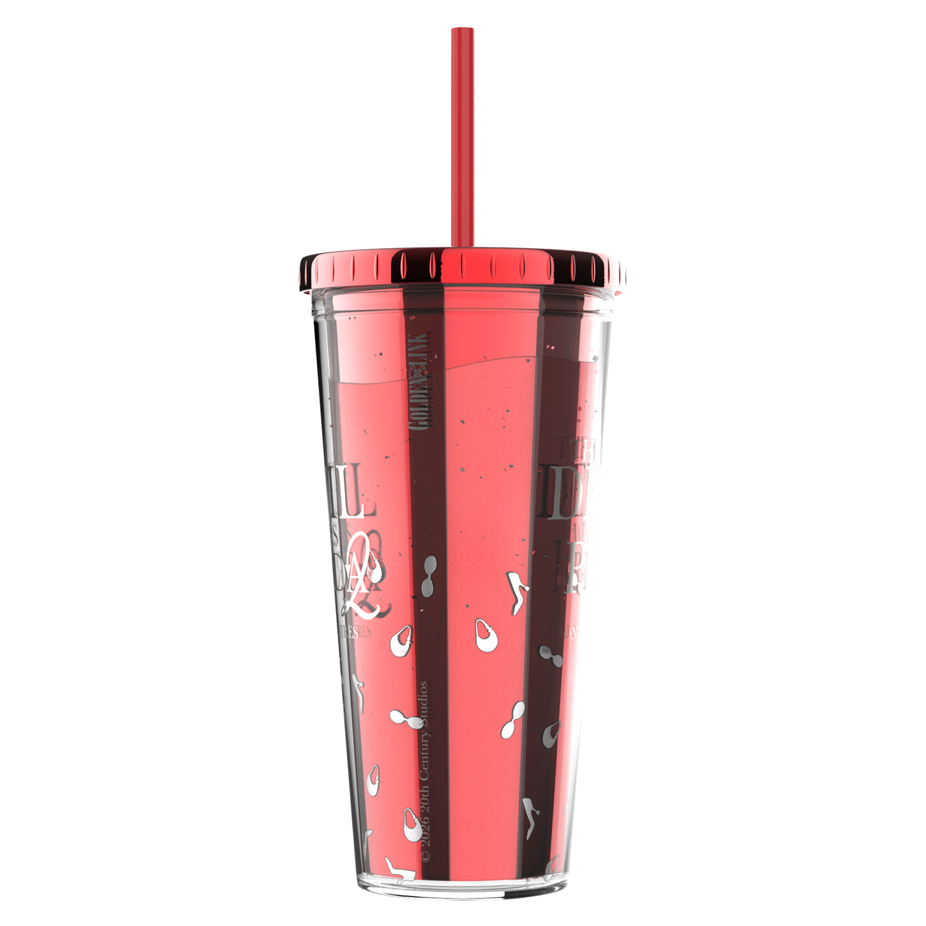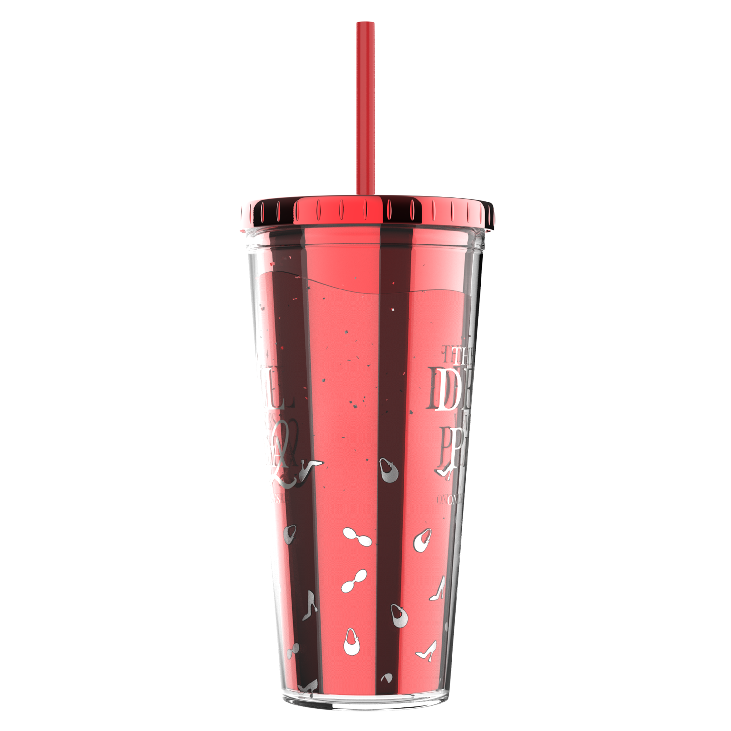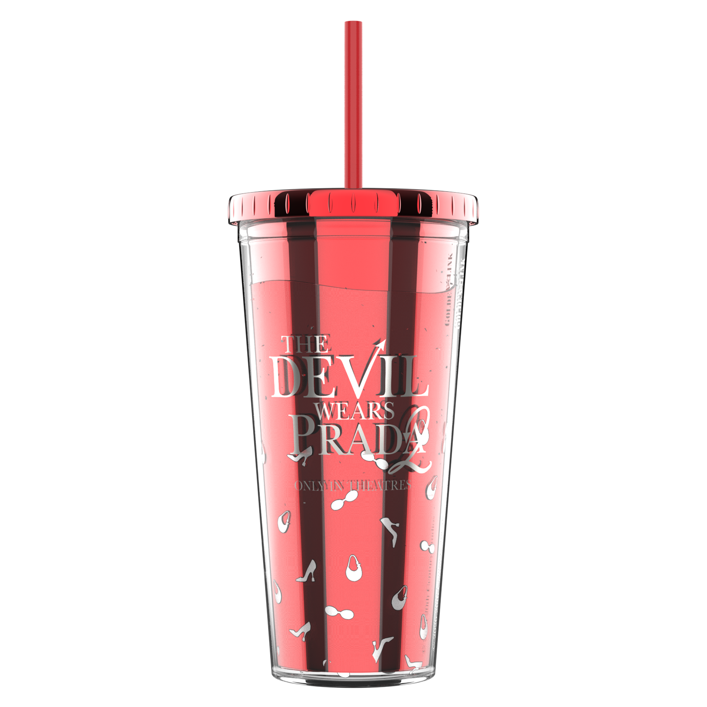 Celebrate the return of fashion's fiercest with this eye-catching tumbler featuring the film's bold logo and floating confetti inside—tiny high heels, purses, and sunglasses that shimmer with every sip. The translucent design in signature devilish red captures the glamorous chaos of the fashion world.