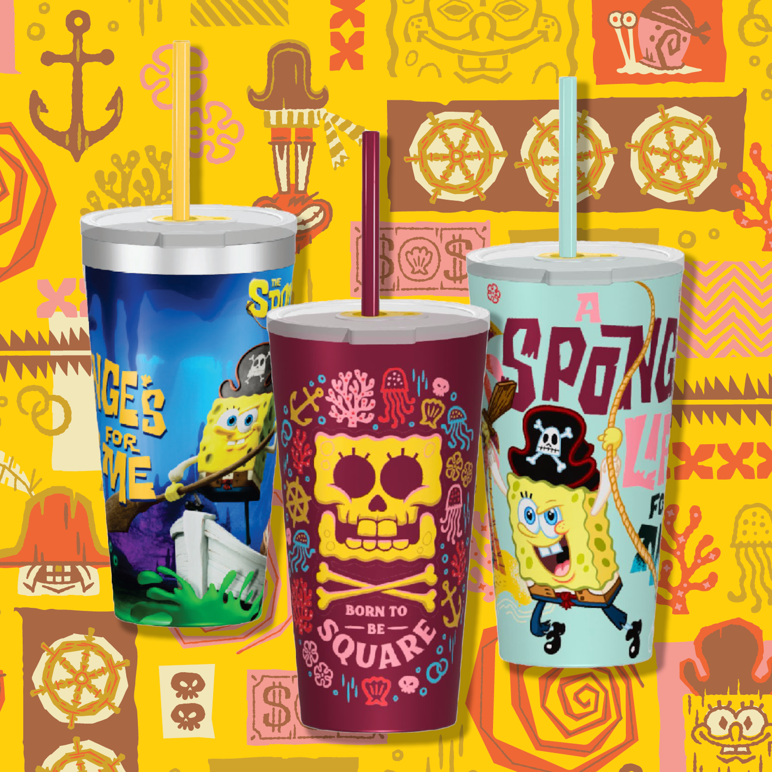 This vibrant steel tumbler captures SpongeBob's swashbuckling pirate adventure in three bold, eye-catching styles.