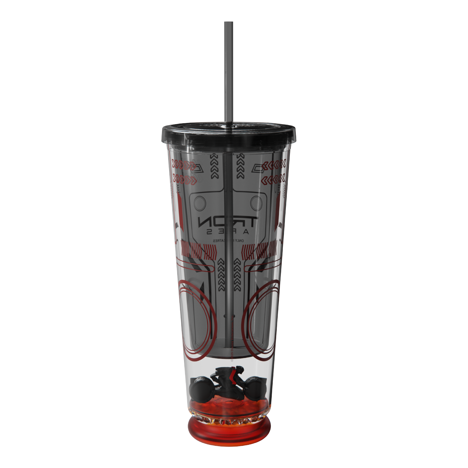 The Lightcycle Tumbler brings the speed of the Grid to every sip. Watch as the detailed lightcycle figurine sits perfectly suspended in the clear base, while LED lights pulse through the red-tinted bottom like energy coursing through the digital landscape.